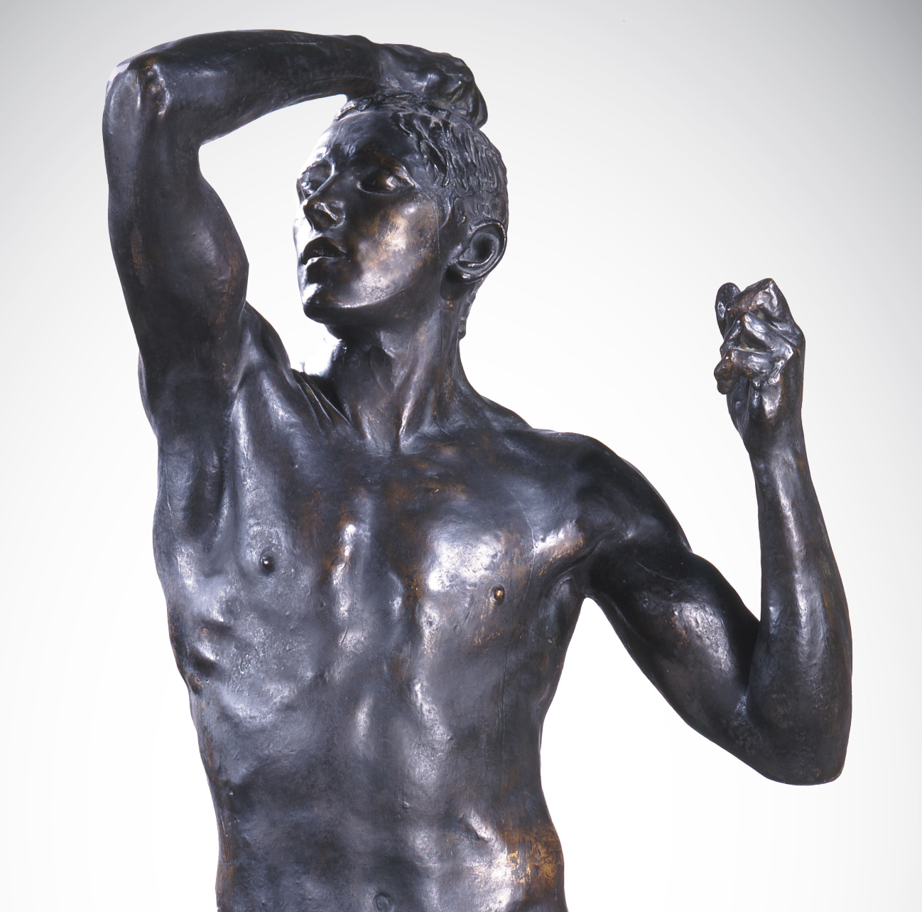A szobor első brüsszeli bemutatásakor, 1877-ben, A legyőzött ember néven szerepelt, ami a francia–porosz háborúban elszenvedett vereséget idézte. Később megváltoztatott címe – eredeti politikai jelentését kitágítva – a tudatára ébredő emberre utalt. A kor szokásainak megfelelően Rodin többnyire az agyagmintáról készült gipszöntvényt állította a közönség elé. Amennyiben vevő jelentkezett, sor kerülhetett a szobor bronzba öntésére vagy márványba faragására, de a gipszváltozatok is legalább olyan széles körben elterjedtek. A budapesti múzeum számára megrendelt gipszöntvény külön kérésre kapott bronzszínű patinát. A felület mesteri kidolgozása, ragyogó árnyalatai mellett az életnagyságú alak különleges öntési technikája révén ritkaságnak számít Rodin valamennyi patinázott gipsze között.
